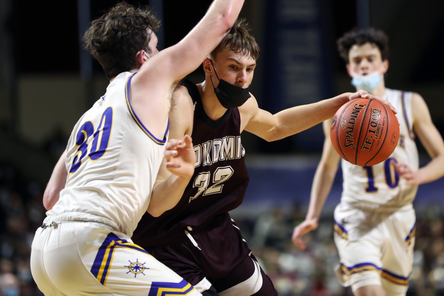 PORTLAND, ME – MARCH 5: Nokomis’ Cooper Flagg maneuvers around Falmouth’s Zach Morrill during the Class A state championship on Saturday at Cross Insurance Arena. (Staff photo by Ben McCanna/Staff Photographer)
